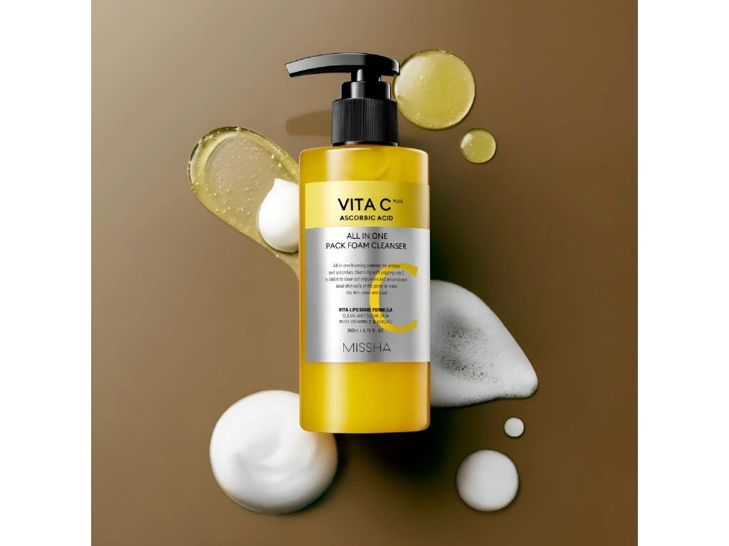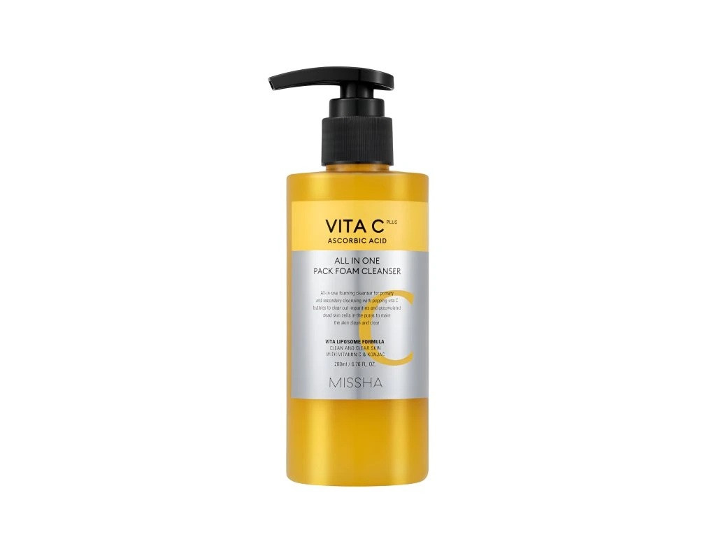 Missha Vita C Plus All In One Pack Foam Cleanser je inovativní korejský čisticí přípravek, který v jednom produktu kombinuje funkce čisticího prostředku na obličej, smývací masky a odličovače. Jeho pokročilé složení působí hluboko v pleti a odstraňuje kožní maz, odumřelé buňky, zbytky make-upu a nečistoty, které se na pleti hromadí.