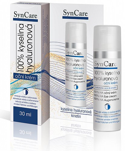 Oční krém s kyselinou hyaluronovou doplňuje řadu péče okolo očí a rozšiřuje skupinu přípravků se 100% kyselinou hyaluronovou. Krém je velmi lehký, ale přitom bohatý na účinné látky. Ihned si všimnete, je hebký sametový pocit pleti po jeho nanesení. Díky obsahu čisté kyseliny hyaluronové a přírodně analogického hemiskvalanu propůjčuje krém pleti jemnost a vitalitu. Látka kinetin působí přímo proti mimickým vráskám a omezuje tvorbu rozšířených cévek okolo očí. Příznivé působení doplňuje arganový olej.